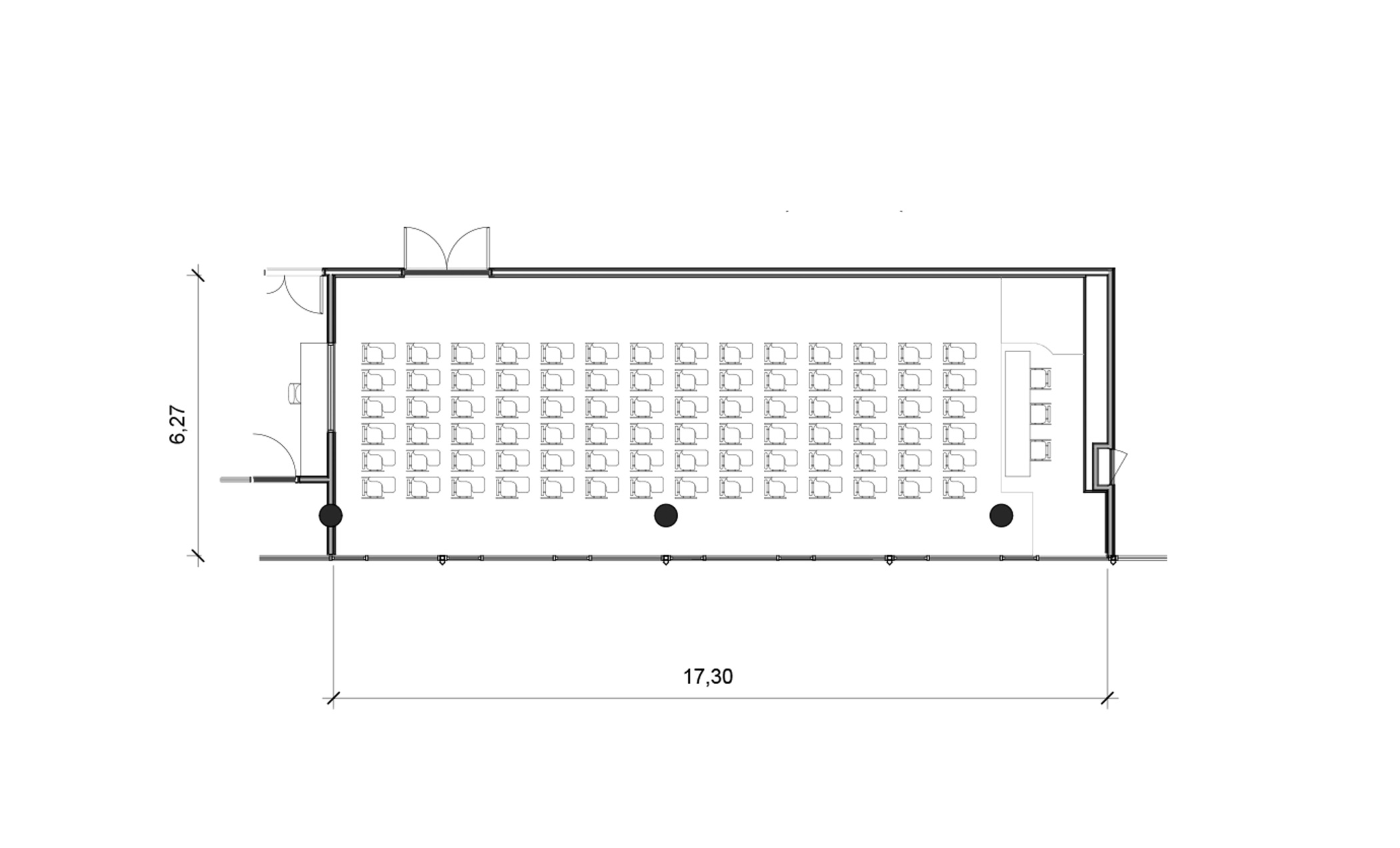 Room 2.1 Surface109 m2 Theater 81 Classroom 48 U shape 41 Boardroom 40 Cocktail 60 Banquet 30 Cabaret 28